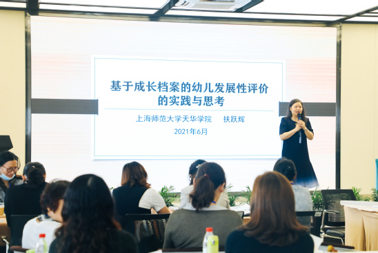 上海师范大学天华学院学前教育学院院长助理扶跃辉博士主讲《基于成长档案的幼儿发展性评价的实践与思考》。扶跃辉从教育案例入手阐明幼儿发展性评价的基本概念,介绍幼儿发展性评价体系的基本结构及实施,即教师如何使用幼儿发展行为观察指引、如何收集幼儿成长档案及如何撰写幼儿发展综合报告。期间,扶跃辉还组织园长们进行了“让幼儿发展性评价园本化实践更有实效性”的分组讨论,就幼儿园开展幼儿发展性评价的现状、措施及困难进行了探讨。