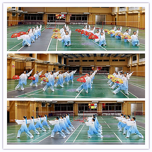 比赛过程中,队员们纸扇纶巾,身着浅蓝色队服,分别手持金扇和红扇,动作连贯流畅、刚柔并济。金红两扇在空中行云流水般地展开,开扇苍劲激昂,收扇短促有力,无不彰显着天华学子意气奋发、团结奋进的体育拼搏精神。