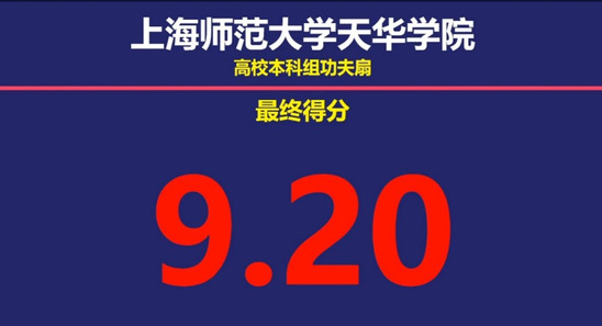 功夫扇队的女队员们巾帼不让须眉,经过与上海交通大学、上海中医药大学、上海师范大学等九所高校的激烈比拼,最终裁判组给出了9.2分的全场最高分,天华功夫扇队勇夺第一名,荣获一等奖!