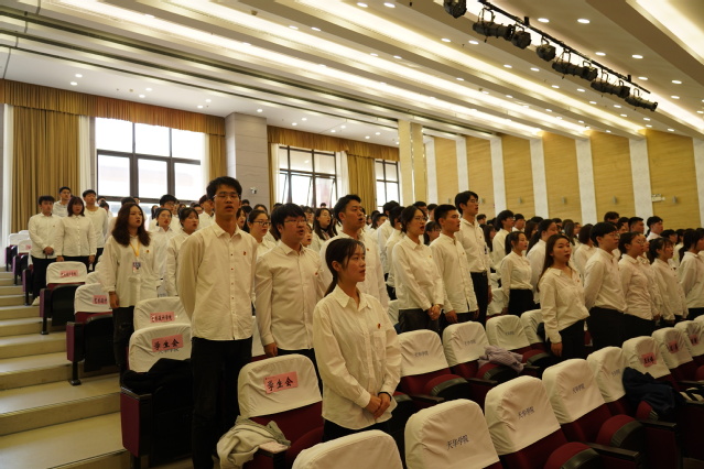 凝聚青春力量,共筑青春梦想——2020年新团员入团仪式凝聚青春力量,共筑青春梦想——2020年新团员入团仪式为进一步加强共青团员组织意识教育,增强共青团员的组织荣誉感,凝聚团组织活力,2020年10月23日下午13:30,校团委在晖华楼报告厅举行了2020年新团员入团仪式。本次新团员入团仪式由XXX主持,学保处常务副处长包静波、学保处副处长兼校团委书记杨央、校团委副书记王晓亮、沈捷参加。大会第一项,全体起立,唱国歌。大会第二项,学保处常务副处长包静波致词,包老师首先对新入团学生表示祝贺,希望新团员能传承和发展优良的团学工作文化和基础,有活力、有朝气的不断发挥青年学生的榜样力量,既履行好个人的团员身份,又注重团体组织建设。包处长希望团干部要提高个人研究能力、吃苦能力以及创新能力,依靠集体的力量,做好工作的部署,从而真正从思想上、行动上积极向党组织靠拢。 大会第三项,团委副书记王晓亮宣读新团员名单,本年度共有75名同学被光荣地批准加入共青团。大会第四项,领导老师为各学院新团员代表颁发团员证、团徽,老团员为新团员佩戴团徽。共产主义青年团团徽是由团旗、齿轮、麦穗、初生的太阳及其光芒,写着“中国共青团”五字的绶带组成。它象征着共青团在马列主义、毛泽2020-10-26