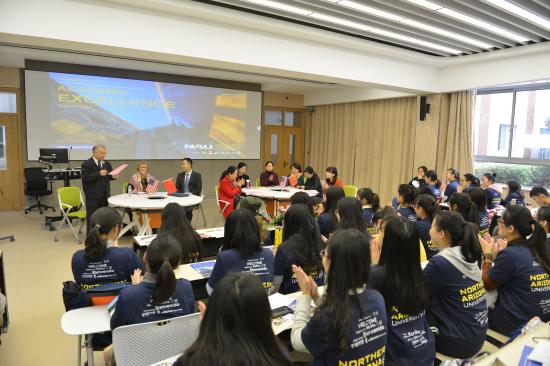 美国北亚利桑那大学举行国际课程班开班仪式2018年12月5日,美国北亚利桑那大学(NorthernArizonaUniversity)来访我校,就两校合作深入商洽,并隆重举办2018级学前教育(国际课程合作)、英语(国际课程合作)专业开班仪式。2018-12-10 -