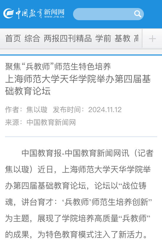 周到新闻晨报 | 上师大天华学院举办第四届基础教育论坛,共话“兵教师”师范生特色培养来源:周到|新闻晨报 2024年11月8日标题:2024中芬职业教育上海论坛举行 启动中芬教师教育上海中心记者:崔翼琴自2022年起,随着《退役军人事务部 教育部 人力资源社会保障部关于促进优秀退役军人到中小学任教的意见》的颁布实施,中小学校园内涌现了越来越多英姿飒爽的“兵教师”。上海师范大学天华学院紧跟国家步伐,积极响应号召,致力于在“兵教师”师范生培养模式上寻求创新突破。2024年11月8日,上海师范大学天华学院成功举办第四届基础教育论坛,以“战位铸魂,讲台育才:‘兵教师’师范生培养创新”为主题,展现了学院培养高质量“兵教师”的决心,为特色教育模式注入了新活力。上海市退役军人就业创业服务促进会向奎副会长表示,就业创业是关乎社会稳定和发展的重要议题,对于退役军人而言,更是他们人生转折路上的关键环节。此次论坛聚焦于就业创业与教育的融合,为彼此提供了一个宝贵的交流与合作机会。初等教育学院副院长胡雅楠说,天华学院依托独特的“军味”校园文化,积极响应国家政策,致力于培养忠诚于党、践行师德、纪律严明、作风优良的小学教育人才。2023年,小学教育专业(体育方向)首批招收 28 位退役军人。2022024-11-11
