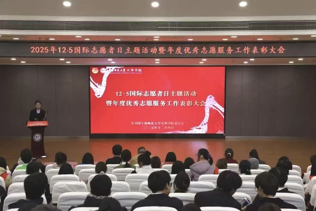 我校举行12·5国际志愿者日主题活动暨年度优秀志愿服务工作表彰大会为进一步弘扬“奉献、友爱、互助、进步”的志愿精神,学校团委于12月4日下午16:30在晖华楼报告厅举行2025年12·5国际志愿者日主题活动暨年度优秀志愿服务工作表彰大会。校团委书记沈捷老师、校团委副书记邱晟吉老师以及各二级学院党总支副书记、分团委书记们出席本次大会。会议由校大学生志愿者协会副会长曹诗瑶主持。会上,校大学生志愿者协会会长王晓帅同学回顾2025年志愿服务工作成果;校团委副书记邱晟吉老师宣读《上海师范大学天华学院2025年度优秀志愿服务工作表彰决定》,与会领导依次为获奖的个人、项目、团队和单位代表颁奖。优秀志愿者获奖代表朱歌同学和优秀志愿服务团队指导老师代表、人工智能学院分团委书记徐婧老师先后上台分享自己的服务经历与感悟,交流志愿服务经验与心得。来自语言文化学院的西部计划志愿者代表武锦茹同学录制了视频,为在座的志愿者们讲述了她在远方土地上关于坚守与成长的故事。校团委书记沈捷老师对会议进行总结讲话,肯定了过去一年志愿服务工作的成效,并对学校志愿服务事业的发展提出提出三点期望:一是深化对志愿服务的认识,凝聚行动共识,主动参与各类服务活动;二是推动志愿服务与专业、思政、实践的深度2025-12-17 -