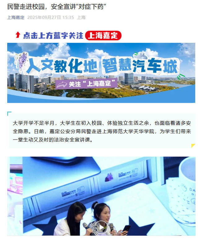 近年来,嘉定公安分局持续开展安全宣传,通过“进机关、进学校、进社区、进企业、进家庭”活动,积极营造全民学安全、懂安全的良好氛围,维护社会大局稳定。此次选择开学季走进校园,也是为了更精准地触达初入社会的大学生群体。