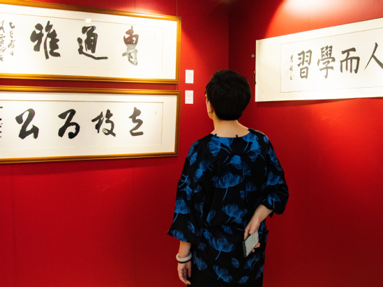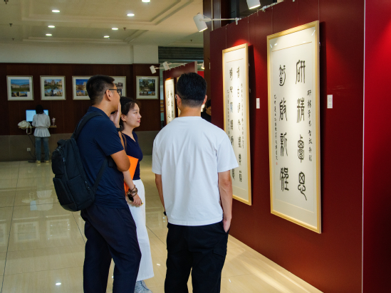 随后,高建华、龚春蕾、郭伟奇共同为书画展揭幕。随着红色幕布徐徐拉开,现场响起了持久而热烈的掌声,本次书画展正式面向全校师生开放。
