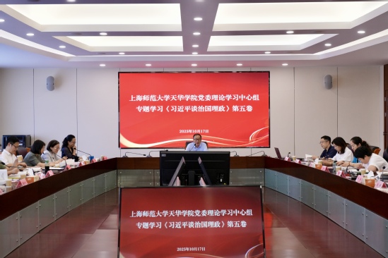 2025年10月17日,上海师范大学天华学院党委理论学习中心组在明华楼五楼会议中心举行专题学习会,专题学习研讨《习近平谈治国理政》第五卷。校党委书记高建华主持并作领学讲话,党委副书记、纪委书记、校长龚春蕾,副书记、副校长许岳作重点交流发言。纪委委员、马克思主义学院院长刘天翔,语言文化学院党总支书记郭阿诺,北亚利桑那学院党总支书记朱可作研讨发言,全体校领导、校党委委员、校纪委委员、各党总支书记以及旁听列席代表参加会议。