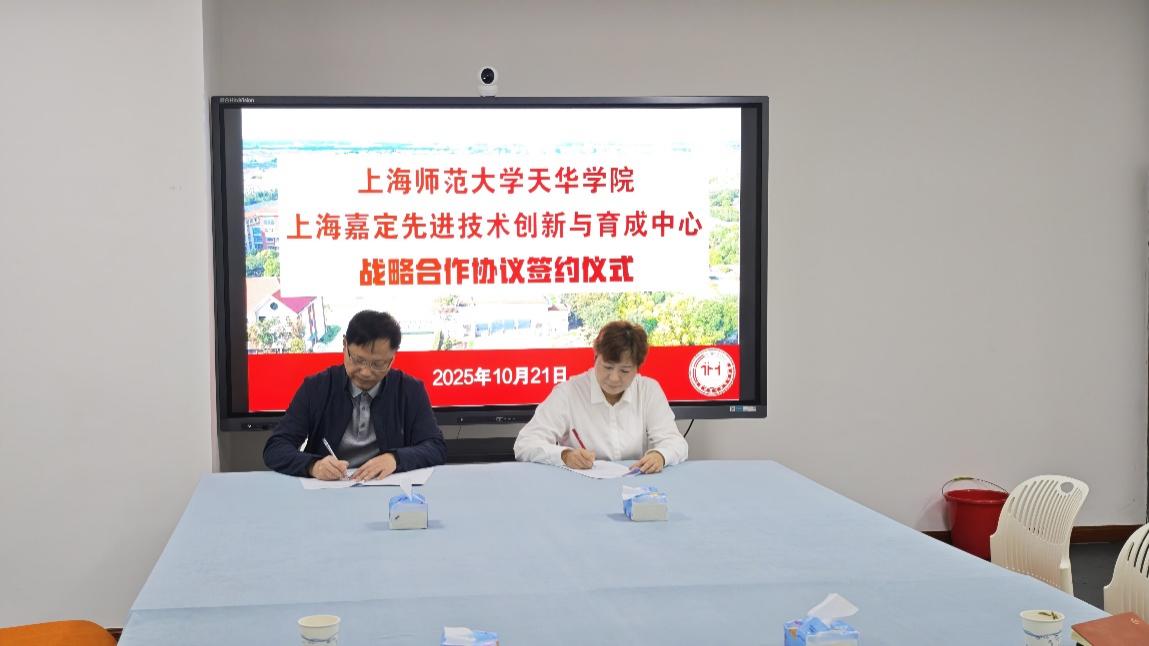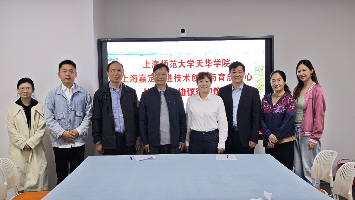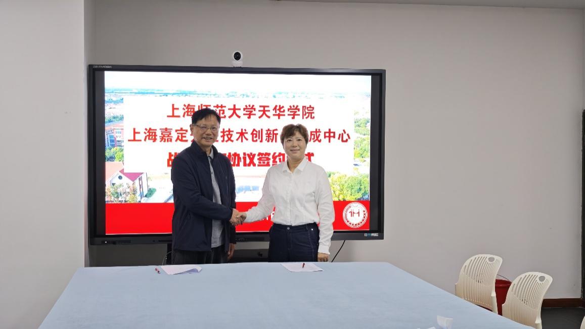 2025年10月21日12:00,健康学院与上海嘉定先进技术创新与育成中心(以下简称“育成中心”)在上海师范大学天华学院东校区(上海天华人工智能科创园)正式签署战略合作协议。出席本次仪式的有上海师范大学天华学院副总校监朱国权、健康学院院长徐晓峰、天华学院对外合作培训学院常务副院长周建文、健康学院党总支书记答英娟,上海嘉定先进技术创新与育成中心主任徐美芳、转化医学网创始人潘浏阳等。