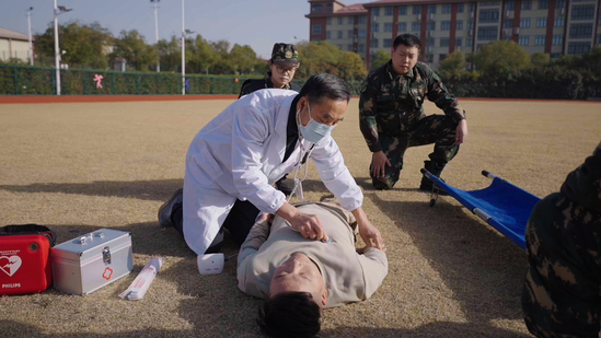 在处置突发事件的同时,医疗救护组携带急救箱同步介入救援。医护人员迅速对 “伤员” 进行生命体征评估,熟练开展止血包扎、心肺复苏等急救操作,并使用应急标识清晰标记伤情等级。待模拟急救车抵达后,校医详细向专业医护人员交接受伤经过、现场处置措施及伤员实时生命体征数据,协助完成伤员转运工作,两名保卫干事随车护送,构建起 “学校初级急救 – 医院深度救治” 无缝衔接的生命通道。