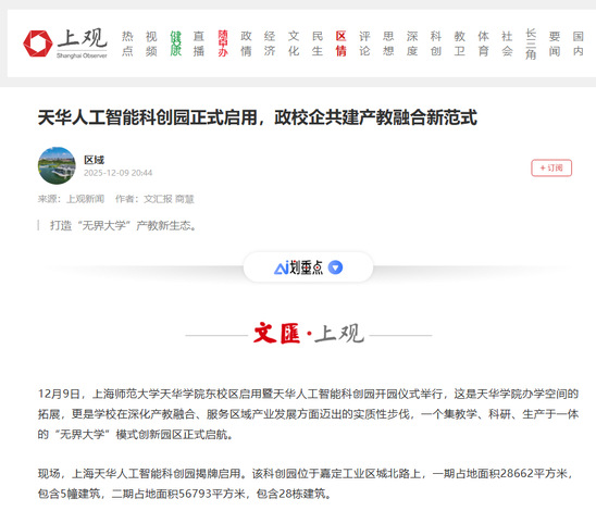 12月9日,上海师范大学天华学院东校区启用暨天华人工智能科创园开园仪式举行,这是天华学院办学空间的拓展,更是学校在深化产教融合、服务区域产业发展方面迈出的实质性步伐,一个集教学、科研、生产于一体的“无界大学”模式创新园区正式启航。