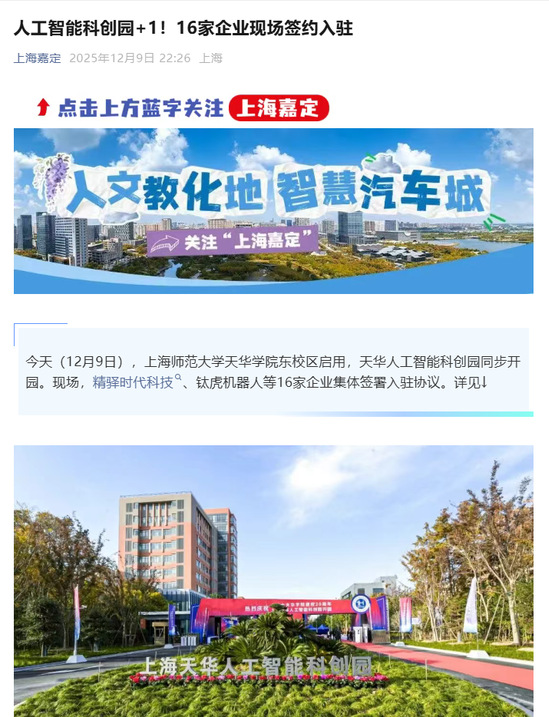 今天(12月9日),上海师范大学天华学院东校区启用,天华人工智能科创园同步开园。现场,精驿时代科技、钛虎机器人等16家企业集体签署入驻协议。详见↓