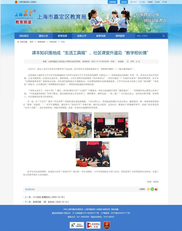 12月10日,嘉定区政府官网教育信息平台发布题为《课本知识落地成“生活工具箱”,社区课堂升温见“教学相长情”》的文章,生动记录了课程现场的热烈场景。