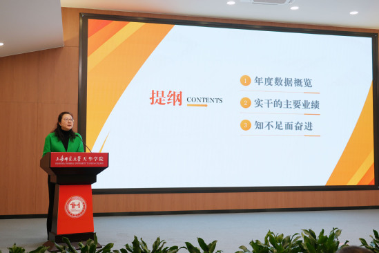 校长龚春蕾代表行政团队作总结,首先用一组组详实的数据展示了学校本学期的发展成效。在人才培养上,开展大规模“招培就联动”,对专业进行优化调整;在产业发展上,天华人工智能科创园区建设成效显著,完成一期楼宇修缮与改造,与嘉定高科技园区联合招商,20家优质企业签约入驻;在课程建设上,“天华智学”平台全面上线,师资队伍建设取得突破,教师在各类大赛中佳绩频传;在服务学生上,完善转专业细则,实施学业帮扶计划,学生在各类全国和省部级职业技能大赛中取得多个奖项;在科研项目上,划定项目申报孵化计划,修订科研和教学奖励办法;在安全规范上,新增和完善十余项规章制度。龚春蕾还指出,学校在专业转型人才支撑、产教融合深度、科研实力提升等方面仍存在不足,需在后续工作中精准发力。