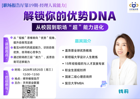 嘉宾简介:钱 莉盖洛普全球优势教练斯坦福大学设计人生教练15年组织与人才发展专家职业生涯规划师国家二级心理咨询师复旦大学MBA讲座亮点:1、从“短板”思维转向“优势”视角,提升自我笃定感2、看见AI时代的底层能力,识别自我优势,找寻核心竞争力3、通过职场的三层“能力”,反思自我可迁移能力时间:2026年3月25日(周三)12:00~12:50地点:晖华楼报告厅