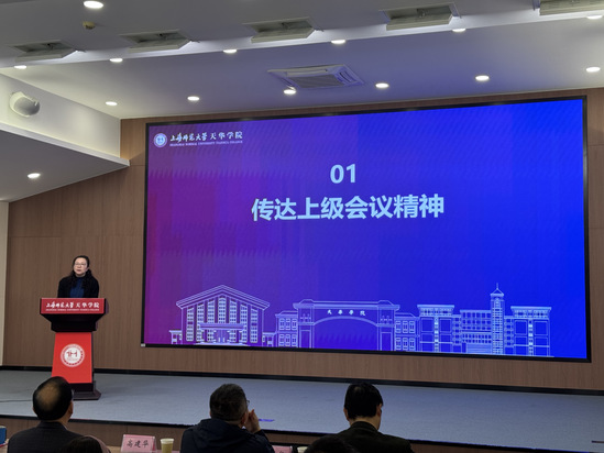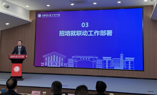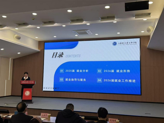 随后,校长助理、就业与生涯指导中心主任胡珍作专题汇报。胡珍先是对2025届毕业生就业情况进行了复盘。从整体数据看,2025届毕业去向落实率保持在较高水平,不同学院在签约就业、合同就业、升学及其他就业去向方面各有特点,部分专业实现了较高就业率。二是对2026届就业形势进行了分析。三是介绍了学校在就业指导与服务方面的具体做法。通过就业帮七个课堂(职规课、实践赛、报告厅、咨询室、进企业、学生会、云课堂等)和特色化的创新创业服务和校友会,为学生提供全过程就业服务。四是对2026届就业工作推进作了具体安排,要求各学院进一步明确时间节点,强化毕业生动态摸排,做实做细分类指导和精准帮扶,切实提升毕业生就业指导与服务的获得感。