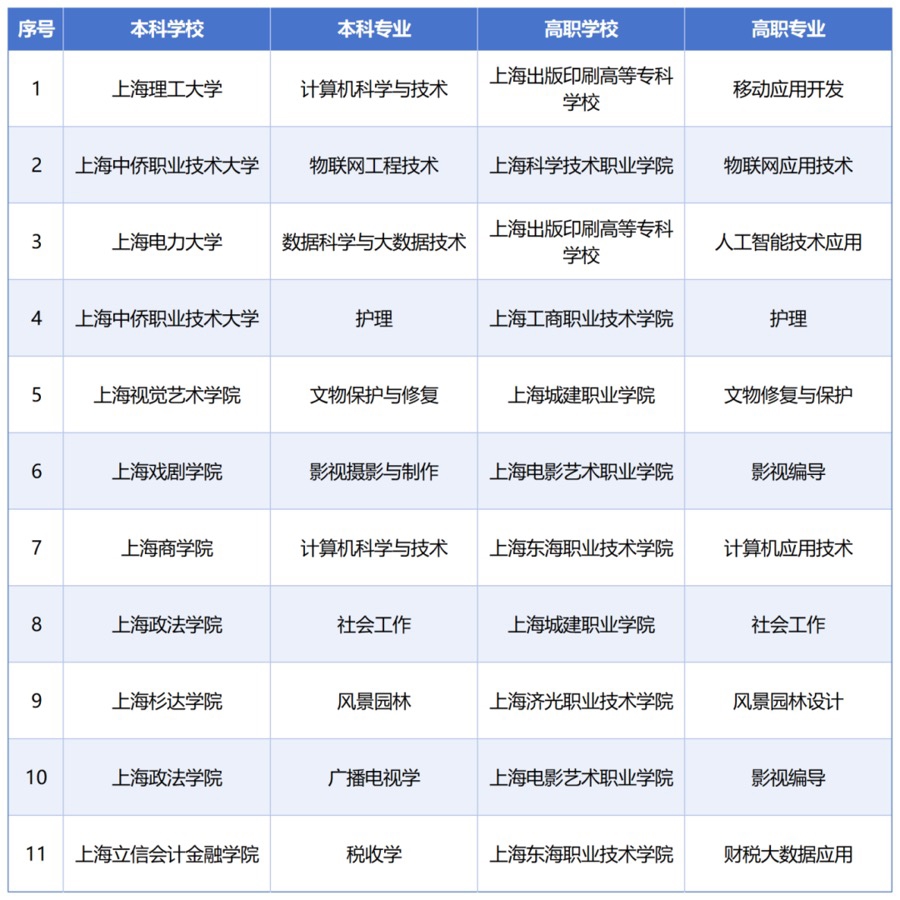 上海市教委近日发布《上海“专科高等职业教育—应用型本科教育”人才贯通培养试点实施方案》,经学校申报、专家评议及市教委核定,同意2026年增设上海理工大学与上海出版印刷高等专科学校联合申报的计算机科学与技术等11个专科高等职业教育—应用本科教育贯通培养模式专业。