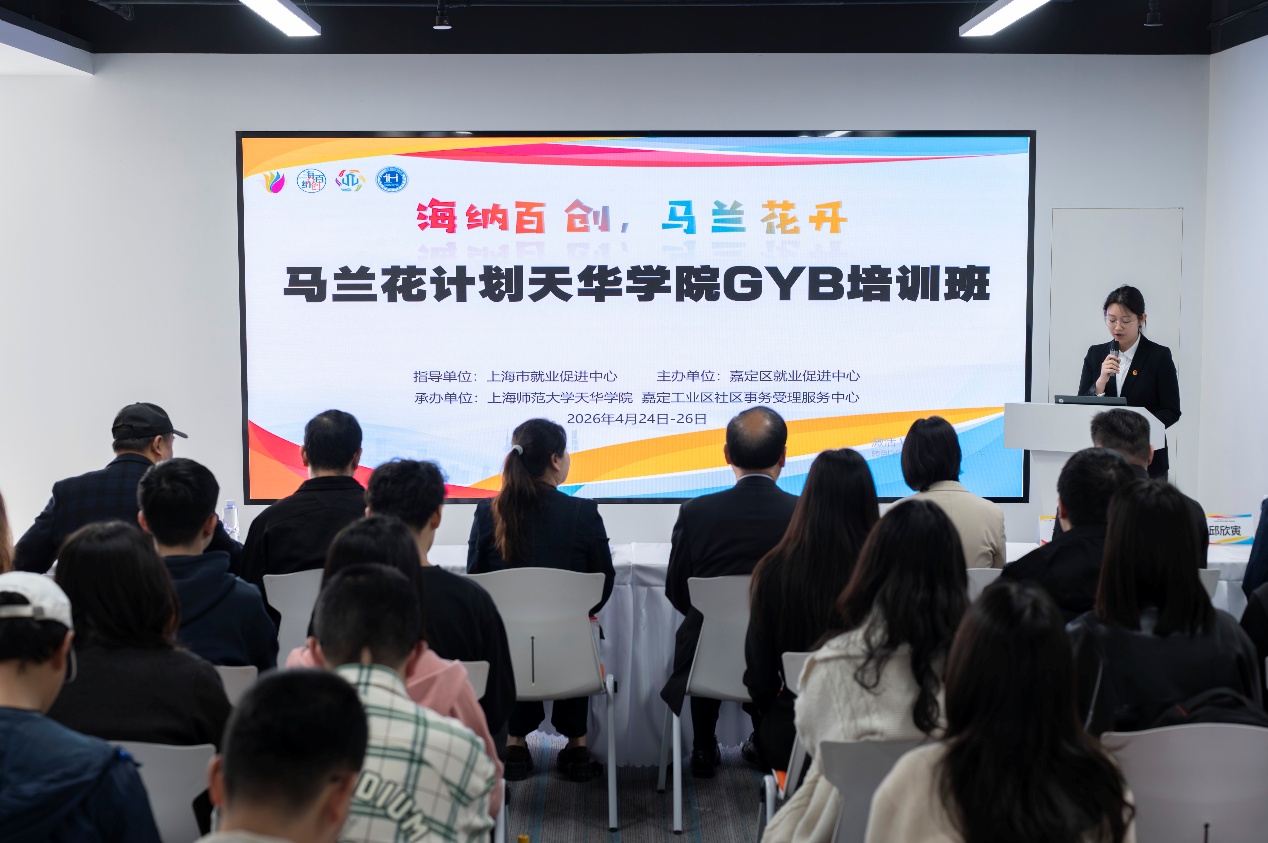 为进一步聚焦创新创业人才培养,夯实学校双创教育教学基础,搭建校地企协同育人平台,2026年4月24日,上海师范大学天华学院就业与生涯指导中心(创新创业中心)在天华人工智能科创园大学生创新创业中心,举行“马兰花计划”GYB创业培训班开班仪式。本次活动是学校助力2026中国国际大学生创新大赛的重要赛前赋能环节,也是深化校地合作、推动创业教育高质量发展的关键举措。