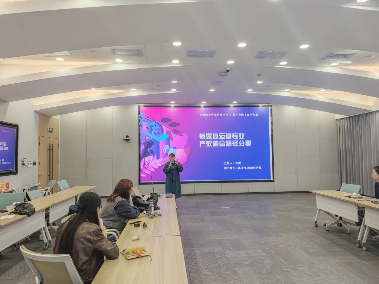 随后,来自天下秀数字科技集团第十八事业部教培业务部的杨雯老师,围绕新媒体营销行业需求、人才培养痛点与校企协同实践展开系统分享。她分析认为,当前新媒体行业人才需求激增、市场规模持续扩大,但高校人才培养与产业实际之间存在着结构性错位。