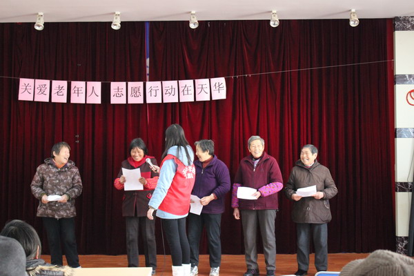 | 为引导广大青年学生继承优良传统,弘扬志愿服务精神,2014年3月5日,由语言文化学院分团委学生会组织的“关爱老人,志愿行动在天华”活动在嘉定区天华社区的晚会厅中展开。 青年志愿者们为老人们专门排练了精彩的节目,包括歌曲《水调歌头》《甜蜜蜜》《董小姐》,舞蹈《映山红》,以及老人们喜爱的东北二人转《热火舞秧》等。还与老人们一起进行了仙人指路和萝卜蹲的游戏,并给老人们带去了精美的礼物,会场气氛融洽美好。最后,志愿者部部长动情地讲述了自己和爷爷奶奶的故事,引发了老人们的共鸣,也赢得了在场所有人员的热烈掌声,为本次活动划下了完美的句号。 | ||