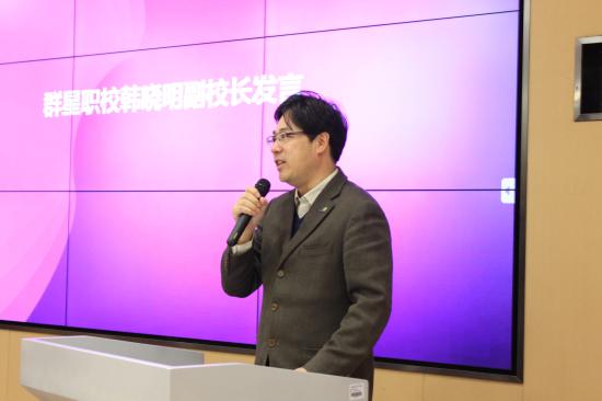 接待仪式的最后,群星职业技术学院副校长韩晓明讲话,他首先感谢了天华学院的热烈接待,并对学生们提出了高要求,希望大家能在三年的学习中取得优异的成绩,以自豪自信的姿态正式步入天华大门。
