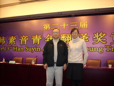 | 英语系广大青年教师和学生在副院长、常务副系主任史文博士的倡导和热情鼓励下,积极参加国内水平最高、影响最广的第二十三届“韩素音青年翻译奖” 竞赛又获佳绩。青年教师韦晓英同志荣获汉译英组三等奖,在两千余名参赛选手中名列第八。10月底,英语系万正方教授、韦晓英老师前往北京参加在对外经贸大学举行的颁奖典礼并领奖。 | ||