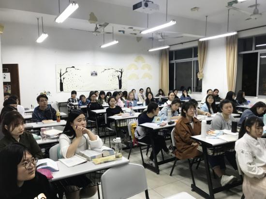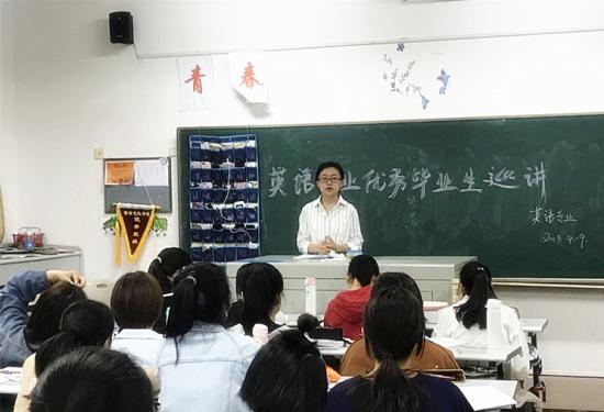 2018年4月19日19:30,语言文化学院英语专业在日华楼教室开展了“优秀毕业生巡讲”活动。该活动旨在响应学院党总支提出的“一份眷恋留天华,满腔激情走四方”倡议,也是我院2018届毕业生“八个一”感恩母校内容之一。活动邀请了2014级优秀毕业生刘锡平同学返回母校,就如何做好大学期间学习规划做专题演讲。英语专业辅导员张旭和沈美老师出席了会议。