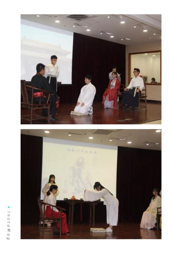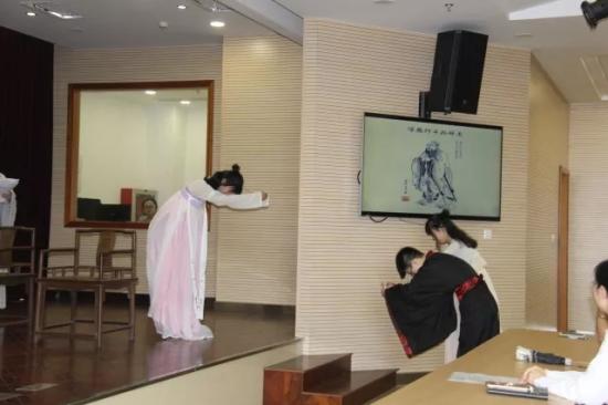 活动开始,首先是2017汉语言文学2班展示的男子成人礼——冠礼。冠礼是是华夏民族嘉礼的一种,是古代中国汉族男性的成年礼。其流程较为繁琐,首先选定吉日举行加冠仪式。冠礼时,被加冠的年轻人身穿童子服,跪坐席上,由跪坐在旁边的司仪替其挽髻,大宾手执缁布冠,大声诵读祝词,然后为其戴缁布冠。冠者起立,到东厢房换上与此冠相应的整套衣服、鞋子,再出来,向在场的人致意。这是初加。类似的仪式要重复三次,初加之后,还有再加、三加。三次加冠后,冠者行拜礼:一拜父母,表示感念父母养育之恩;二拜正宾,表示对师长和前辈的尊敬;三拜炎黄,表示传承文明,报效国家的决心。