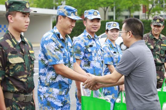 随后,史院长带领参加慰问的学院党政领导为辛苦训练的教官们逐一送上慰问品,并同他们亲切握手,表达对他们辛勤工作的感谢和肯定。最后,史院长祝愿全体语言文化学院2016级学子能够在9月8日阅兵仪式上以最佳精神面貌和仪表仪态接受学校领导的检验。