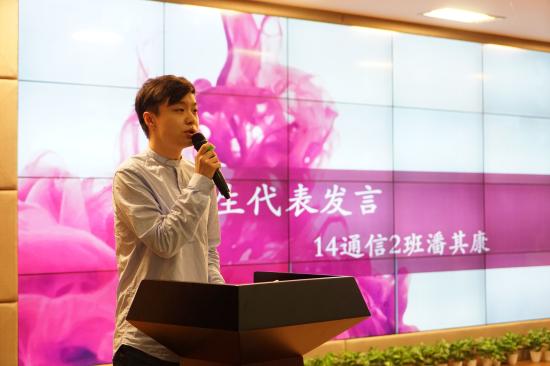 随后,工学院学生代表潘其康同学上台发言,作为在上一届筑梦杯技能大赛获得第二名好成绩的工学院学子,他给大家阐述了他对于专业学习的一些方法和思路,告诉大家只是在课堂上学习是远远不够的,一定要在学好课堂内容的基础上,加深并补充课外内容,同时坚实自己的专业技能,才能更好地应对以后可能遇到的更加困难的问题。说到最后,这位已经大四,即将离开大学校园的学长表达了自己对筑梦杯圆满成功的祝愿,也对他的老师,搭档在他成长道路上的陪伴送上了自己最诚挚的谢意。