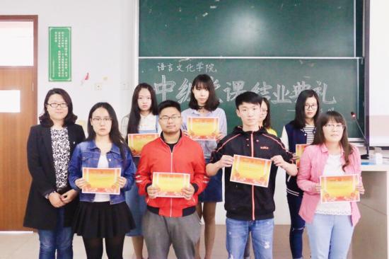 典礼在庄严的国际歌声中正式开始。语言文化学院党总支副书记杨央对本期中党培训工作作了简要总结。她对本次培训课程的设置、考核要求和标准等进行了回顾,着重对考核方式进行了详细的讲解,表扬了部分学员在培训过程中的良好表现。紧接着,日语专业支部书记李江涛宣读了本期中级党校17名优秀学员名单,希望他们继续严格要求自我,努力向党组织靠拢,争取早日成为一名真正的党员。会议第三项议程是由来自2016汉语言文学2班的胡晨曦同学作为优秀学员代表交流发言,分享了她在中党学习中的收获和感想,并对组织的教育和培养表示感谢。随后,各班级代表上台领取了结业证书和优秀学员奖状,并合影留念。