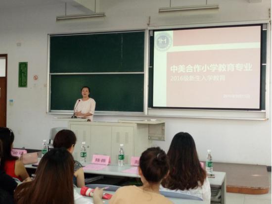 2016年9月13日上午8:30,教育学院在日华楼201阶梯教室召开小学教育中美合作专业2016级新生入学教育大会。出席本次大会的有我校副校长龚春蕾、校党委书记助理凌琦,教育学院院长滕薇、国际交流处处长胡珍、教育学院副院长徐娟、中美合作小学教育专业主任吴彬彬以及教育学院的部分任课老师和辅导员。