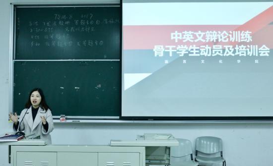 动员阶段:语言文化学院党总支在学期初工作安排中,明确提出要认真落实中英文辩论训练,并制定了详细的训练计划,每一名辅导员也根据所带班情况制定了相应的推进计划。3月23日,语院党总支在日阶102召开了全体师生的中英文辩论训练动员大会。会上党总支书记孙超老师详细介绍了开展中英文辩论训练的意义与重要性,明确了训练方向。接下来,每位辅导员老师都召开动员班会,明确了开展中英文辩论训练的意义和具体方案,使每一位学生都能了解辩论含义,明确训练目的,并积极参与其中。