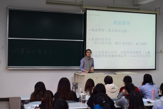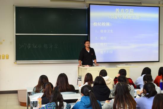 教育学院2013级毕业生根据教学安排已于2016年10月31日返校,开始为期8周的在校学习。为了响应我校就业办提出的各二级学院召开就业指导会的要求,教育学院分别在11月01日、11月3日的下午16点15分,在日华楼302阶梯教室召开了就业指导会。此次指导会由学前教育专业第二支部书记杨荻老师主讲,党总支副书记何凯老师以及毕业班辅导员也借此机会向毕业生们提出了要求与规定。本次指导会旨在为毕业生分析就业前景,指导就业方向,帮助同学们梳理毕业前应完成的几大重要事项,帮助毕业生成功就业。
