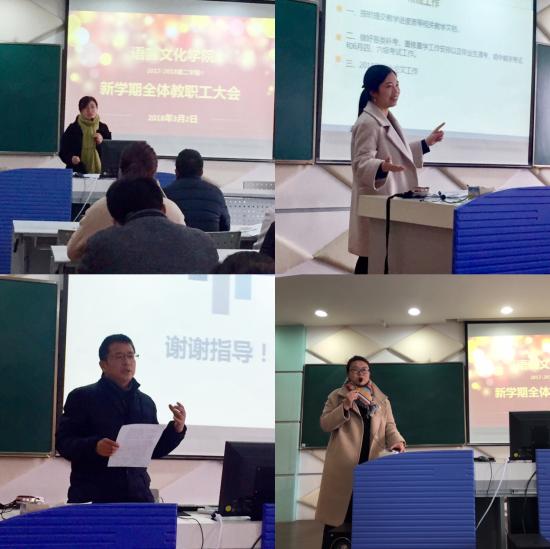 首先,常务副院长陈再阳部署了新学期开学各项准备工作,要求各专业任课教师务必准时上课,严格遵循“6带”的要求规范课堂教学;做好期初学生补考辅导、监考阅卷等工作,严抓考风,严格管理;坚持教学质量督查,院领导、专业主任听课,老师相互听课等。随后,陈院长围绕2018年培养计划修订、“活力课堂”课程建设、教学文档和期中检查、积极组织参加教学比赛、加速推动国际合作办学进程、深化国学经典教育、实习实训、师资队伍建设、科研工作、新专业申报等方面进行了部署,明确了语言文化学院新学期的发展目标和愿景。最后,陈院长强调:正如习总书记所说,幸福是奋斗出来的。梦在前方,路在脚下。任何美好的梦想,都离不开筚路蓝缕、手胼足胝的努力和探索,希望我们语院全体教职工团结一致,继续发扬爱岗敬业的工作精神,把语言文化学院建设得更好!