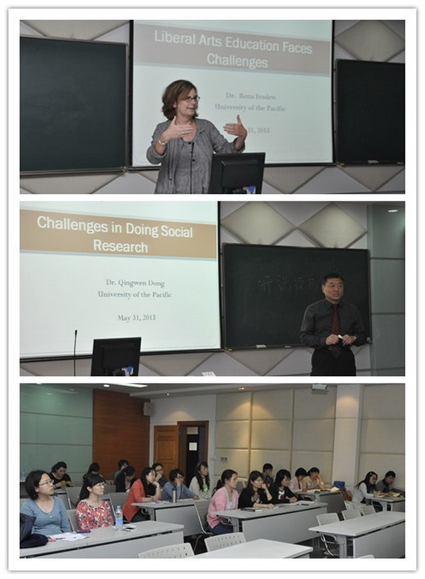 | 2013年5月31日,美国太平洋大学科学和文理学院院长Dr. Rena Fraden和该学院传媒系系主任教授Dr. Dong莅临我校进行访问,并洽谈国际合作项目。 | ||