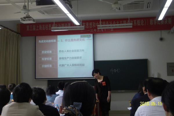 | 2013年5月11日上午,在同济大学举行的“第三届上海高校思想政治理论课教学比赛决赛”中,我院党委委员、思政教研部主任孙叶青老师,在与36名兄弟院校优秀教师的同场竞赛中,荣获三等奖。 | ||