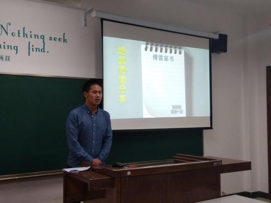 接下来是由16交通运输班级的张翰林同学所带来的集聚家庭温情的《傅雷家书》。演讲者将自我情感带入书中,引发了在场同学的共鸣,体会着书中所展现的浓浓父爱。但他演讲中所加入的互动却有些生硬,在评委老师点评之后,张翰林同学表示会继续改进。