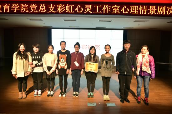 教育学院党总支彩虹心灵工作室自2014年3月成立至今,已有两年时间,举办本次心理情景剧比赛是教育学院心理健康教育工作的一次新尝试,扩大了心理知识的普及面,让更多的同学参与其中,切身学到心理学知识,以更加积极的心态面对学习和生活。