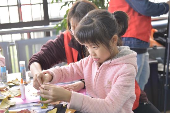 收集完落叶的孩子们便开始本次活动的重要一环:用秋天的落叶来作画。志愿者们将事先准备好的完成稿展示给小朋友们观赏,并详细说明作画步骤,接着由志愿者给孩子们示范如何用秋叶作画,面对着孩子们的“十万个为什么”,志愿者们纷纷耐心又细致地解答,并在现场辅助他们亲自完成。孩子们的动作虽然笨拙,但丝毫不影响他们全神贯注的进行创作。相信看着一幅幅新颖的“忆秋”之作用画框裱起来,被制作完成,每个人的心中都充满了自豪与满足。