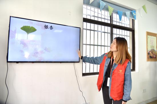 (志愿者们向孩子们说明作画步骤)