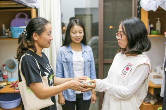 晚会过后艺术设计学院党总支副书记徐姗姗带领在校辅导员来到新生的寝室中,逐一为同学们送上月饼,并关心他们入学一个礼拜以来的生活情况,和同学们聊聊生活上的琐碎事情,让他们感受到学校带来的家一般的温暖。