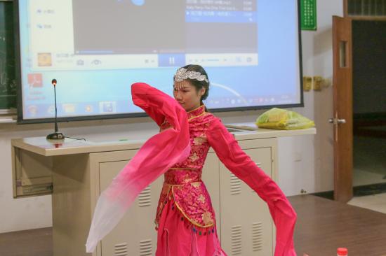 晚会伊始,学院党总支副书记和辅导员们与新生进行亲切交流,送上节日问候,在一片温馨的场景下晚会拉开了序幕。晚会期间,艺术设计学院16级环境设计专业辅导员周欢欢老师为在场的师生献上民族舞,伴随富有韵律的音乐、精致的服装,老师翩翩的舞姿引得全场热烈的掌声。接着由同学们自由上台表演,以歌唱、诗朗诵等形式向大家展示才艺,把现场的气氛推向一个又一个高潮。窗外下着淅淅沥沥的小雨,并不大的教室中却热闹地使人温暖,在这样的氛围中晚会愉快地结束了。