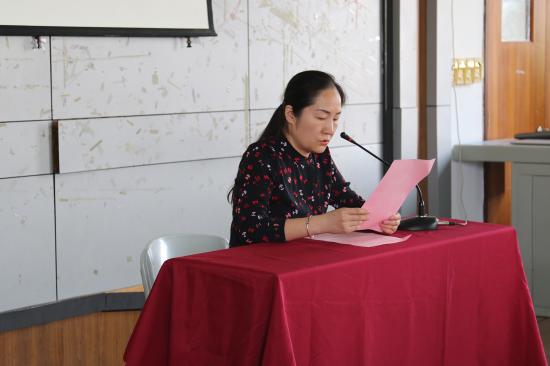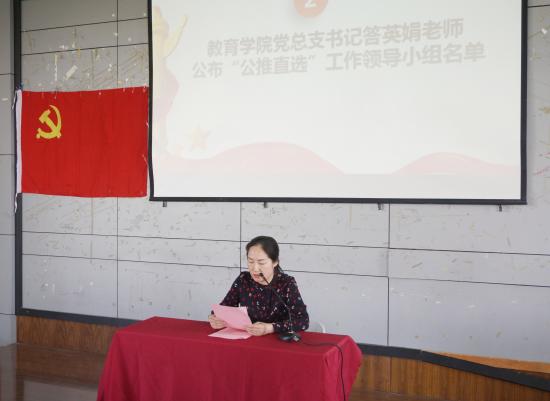 第二项议程是由教育学院党总支书记答英娟老师公布“公推直选”工作领导小组名单。公推直选工作领导组长为答英娟老师,并负责指导基层党支部公推直选工作;副组长为朱可老师、何凯老师;组织委员为颜银树老师;组员有田剑玫老师、狄怨怨老师、姜婷婷老师、贾孟云老师。