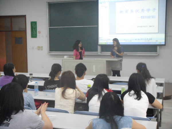 | 2013年6月13日下午16:30,教育系在日阶104举行了优秀学子暨留美经验交流会,邀请毕业生陈时宜介绍留美读硕和读博的宝贵经验。陈时宜讲述了申请国外学校的经验,强调国外院校研究生的申请比起国内来,更加注重个人能力,指出把学习英语当作一种爱好时,更容易取得突破;最后分享了大学时候的一系列照片,展现了她充满酸甜苦辣的学习过程。教育系2011、2012级有意向出国深造的同学参加讲座。 教育系党总支书记沈晓燕简短介绍陈时宜情况。2010年本科毕业后,陈时宜申请到了密苏里州立大学(Missouri State University)攻读“教育与家庭发展”(Early Childhood and Family Development) 硕士学位。2012年进入佛罗里达州立大学(Florida State University)攻读教育心理学(Educational Psychology)博士学位,同时作为研究助理,半工半读,各方面表现非常优秀。 | ||