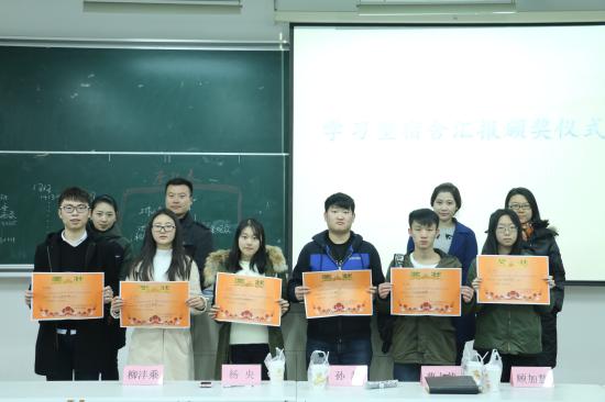 在聆听完各位代表发言后,党总支副书记杨央总结发言,首先她充分肯定了本学期该项活动开展所取得的成效,对获得表彰的宿舍及个人表示祝贺,接着指出学习型宿舍工作的推进旨在引导学生惜时,将碎片化的一小时如何合理利用从而立显成效,通过一小时的学习交流顺利完成高中阶段到大学阶段学习方式方法的过度和适应,在学长学姐的帮助下理顺课程体系和重难点,为期末备考树立自信心;同时学习型宿舍活动的开展也体现了各专业党支部党员和积极分子的个人先进性。最后预祝全体学生可以顺利通过期末考试,让自己的学业成绩更上一层楼。活动最后,党总支书记孙超为本学期涌现出的8个优秀寝室,3个优秀结对份子,3个典型帮扶寝室的代表逐一颁奖,并合影留念。