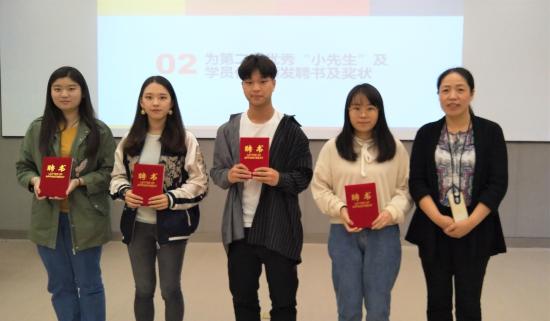 其次,第二期优秀“小先生”和学员代表上台领取聘书和奖状,是他们的不断努力与不计回报的付出,造就了学员们突飞猛进的成绩。