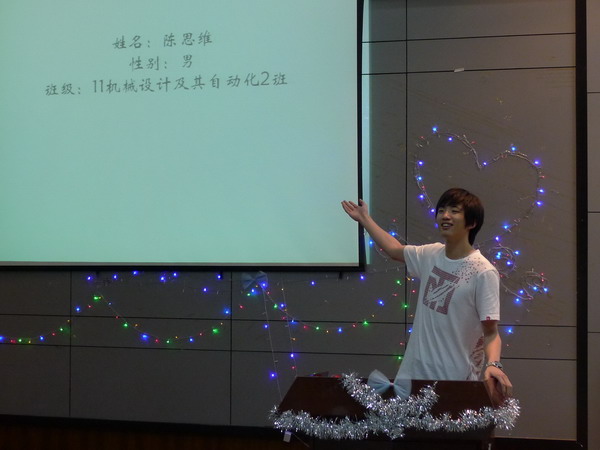 | 2013年6月4日,英语系团总支兼学生联合会生活部举办了“致青春•大学多彩生活”活动。英语系团总支书记杨燕玲、英语系专职教师王思颖、副辅导员李江涛、学习部部长及组织部部长担任评委。 伴随着一首动人心弦的歌曲《致青春》的演唱,本次活动拉开序幕。学校各系参赛选手充分展现自己丰富多彩大学生活,展现方式包括演讲、PPT演示、才艺表演等。经过激烈角逐,最终来自2010级艺术教育4班的陆洋阳获得最佳创意奖,2011级机械设计2班的郑诚同学获得最佳颠覆奖,2011机械设计2班的陈思维获得最佳人气奖,其他参赛选手均获得优胜奖。活动中,同学们用实际行动致敬自己的青春,并进一步坚定了为青春插上梦想翅膀的决心。(英语系) | ||