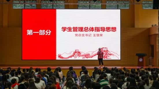首先,我院党总支书记王慧荣老师就我院学生管理工作对2018级新生作指导要求,讲解了我院关于三抓三坚持的具体内容。“三抓”:抓早晚自习英语教学视频播放,抓中英文辩论训练,抓经典阅读;“三坚持”:坚持德育学分制,坚持党员工作站进宿舍,坚持两支辅导员队伍,并且希望同学们可以养成良好的学习习惯,不荒废大学四年的时光,无悔于自己的青春。