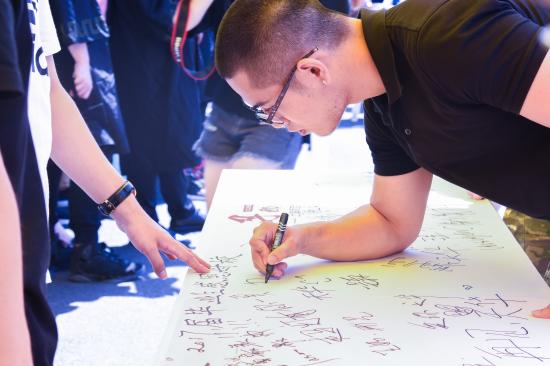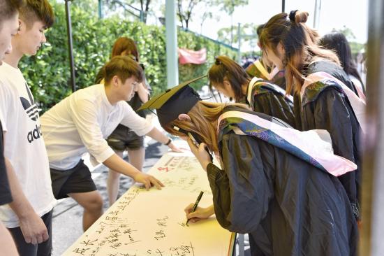 结束了毕业照的拍摄,学长学姐们围聚在艺术设计学院学生会的黄色棚子前,用手中的记号笔写下对母校的依依不舍。长长的横幅上,不同的字迹堆叠拼凑成一份最美的礼物,献给母校。千言万语都难以概括对母校深沉的爱,毕业生们时刻谨记“为做人而学习”的校训,在社会上发光发热。