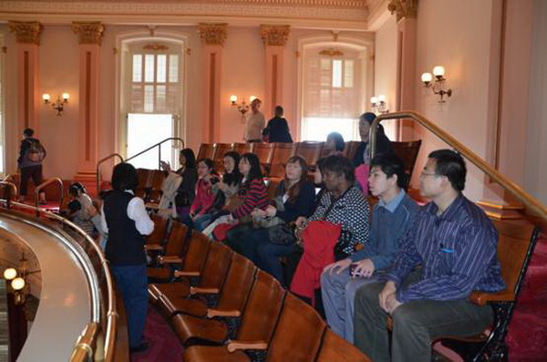 | 2013年3月5日,赴美博士班应Dr. Harris夫妇的邀请,参观了加利福尼亚州首府萨克拉门托的州政府大楼。Dr. Harris夫妇特意安排的华裔工作人员引领我们参观了参议院、众议院和议员的办公室,详细介绍了州政府的工作职能,尤其是坦诚而耐心地回答了我们就加州及美国政治制度、公务员管理及薪水、教育制度等方面提出的问题。 | ||