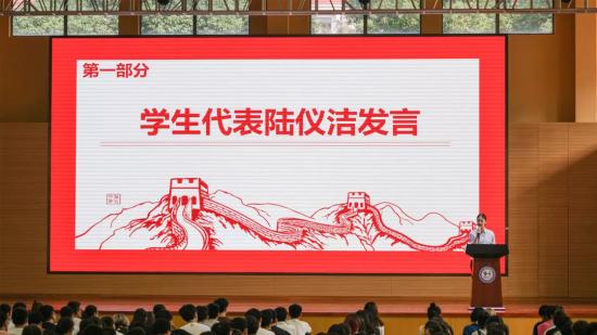 首先,由15级优秀学生代表陆仪洁发言,她从在天华的学习,工作以及生活三个方面入手,希望新生们能够牢记三抓:抓早晚自习英语教学视频播放、抓中英文辩论训练、抓经典阅读,学好英语与专业课,多读经典,做到上课不迟到早退,不违反课堂纪律,尊重课堂,尊重老师,认真学习;多参与学生活动,努力工作,充实自己的大学生活;学习独立与自律,不要将大学的自由化为散漫,抓紧这四年宝贵的时光,做自己喜欢做的事,成为最好的自己。